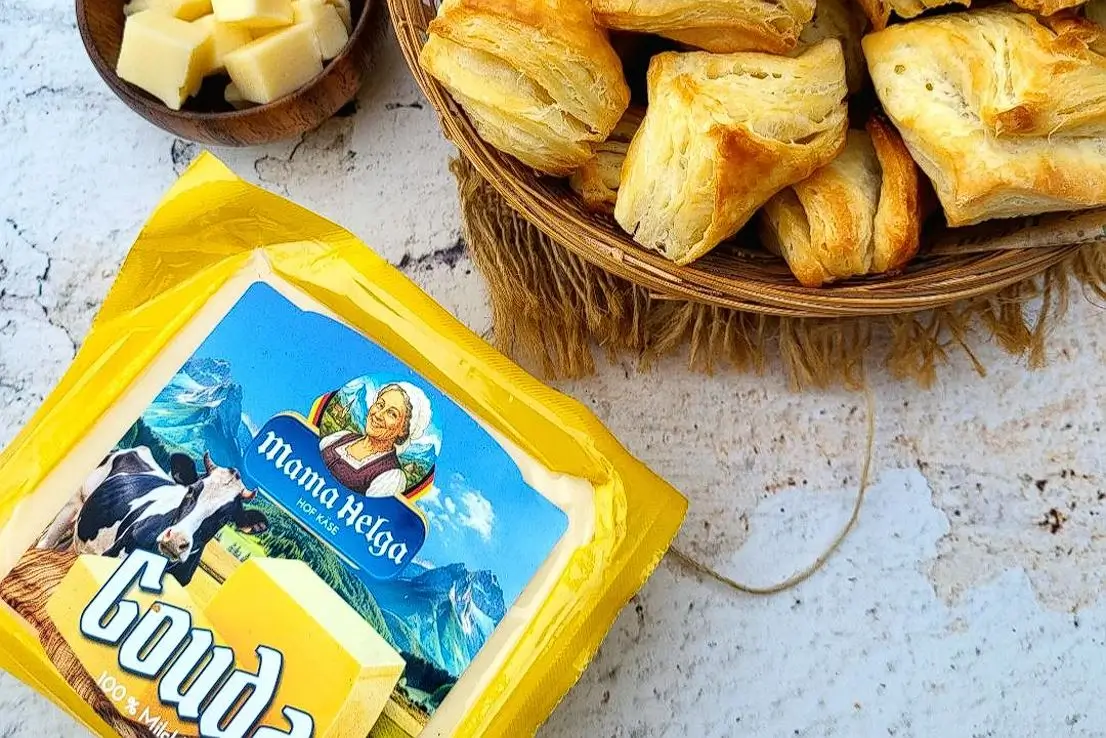 Na svaki staviti kockicu Mama Helga kačkavalja, preklopiti po dijagonali i poređati u pleh.