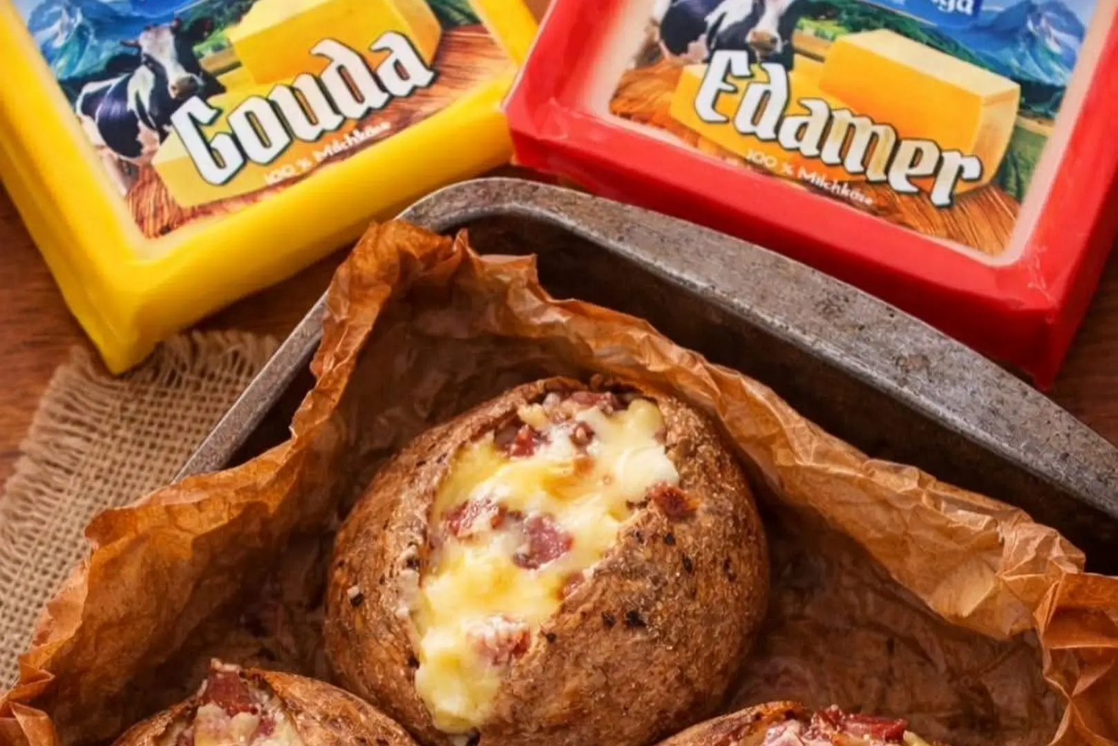 Krompir oprati, izbockati viljuškom, posoliti i peći na 220°C 40 minuta (u zavisnosti od rerne). Pečen krompir izdubiti, izvađeni deo sjediniti sa sitno seckanim sastojcima. Napuniti krompir filom, odozgo izrendati još Mama Helga gauda sira, pa vratiti u rernu nekoliko minuta dok lepo ne porumeni. Na kraju posuti seckanim mladim lukom. Jednostavno neodoljivo.