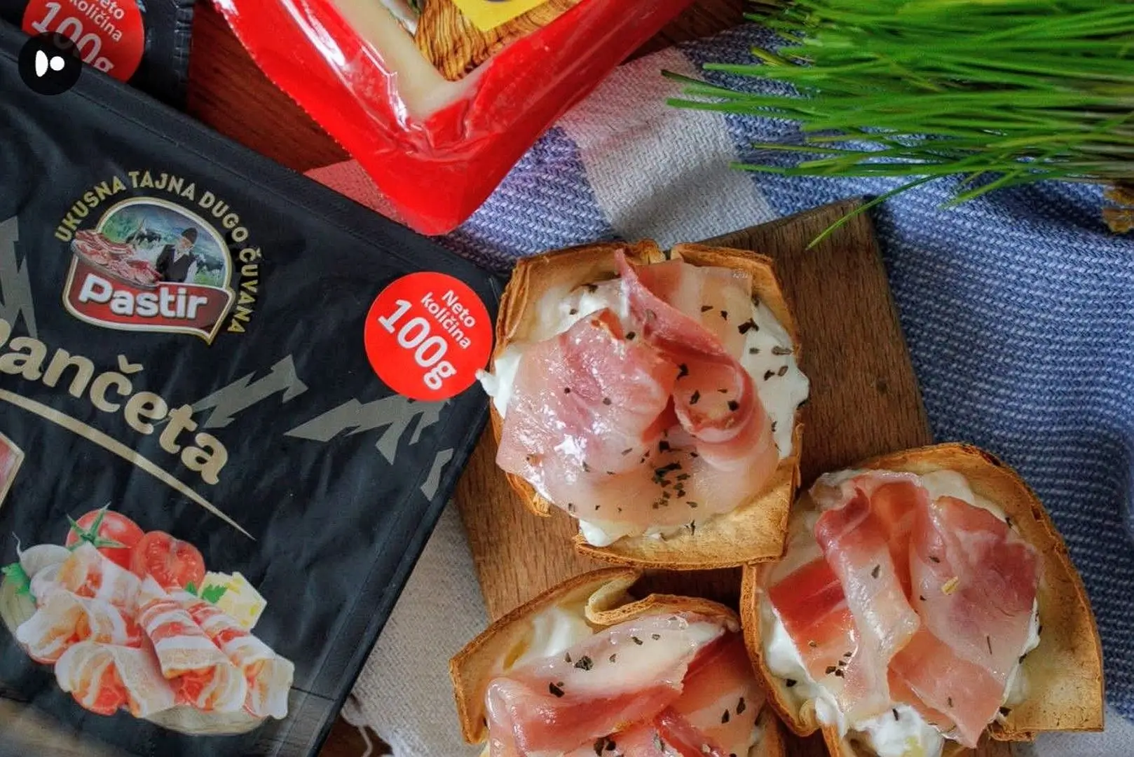 - 300g Pastir pršuta ili drugog mesa, sečenog na tanke slajseve: Pastir pečenica, Pastir kulen, Pastir čajna kobasica, Pastir suvi vrat, Pastir pančeta